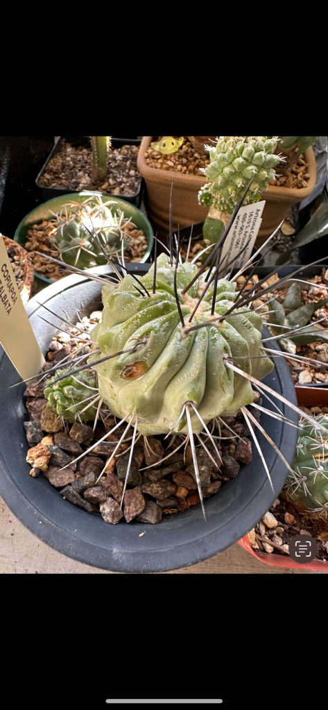 This is the Chilean Atacama Desert cactus Copiapoa dealbata, growing in my collection in Arizona. These cacti are characterized by their extremely long and jagged spines as well a slow growth rate and a chalky exterior farina that protects them from harsh UV rays.